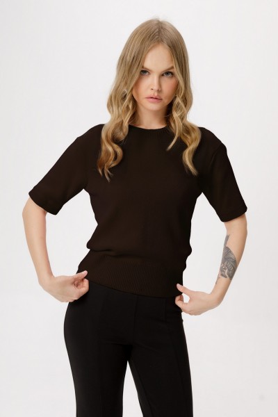 Комплект-двойка из базового хлопкового джемпера с короткими рукавами и трикотажных облегающих брюк-клеш.