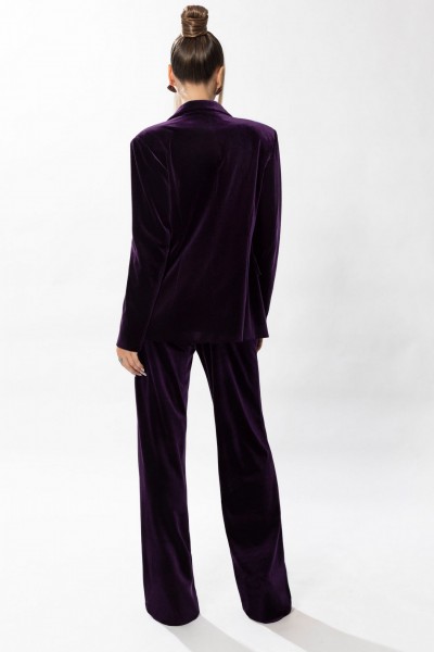 Жакет прямого силуэта с центральной двубортной застежкой на петли и пуговицы, с втачным воротником и отложными лацканами пиджачного типа. По переду с рельефами, выходящими из проймы. На уровне линии талии расположены настрочные клапаны. Спинка со средним швом, рельефами, выходящими из проймы. Рукав втачной, длинный. Брюки прямые, с отрезным поясом. По спинке и частично по переду пояс присборен на резинку.
