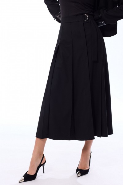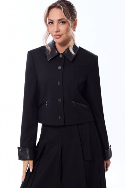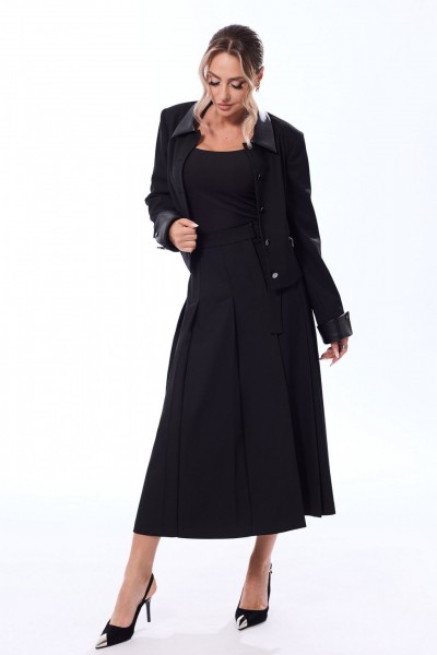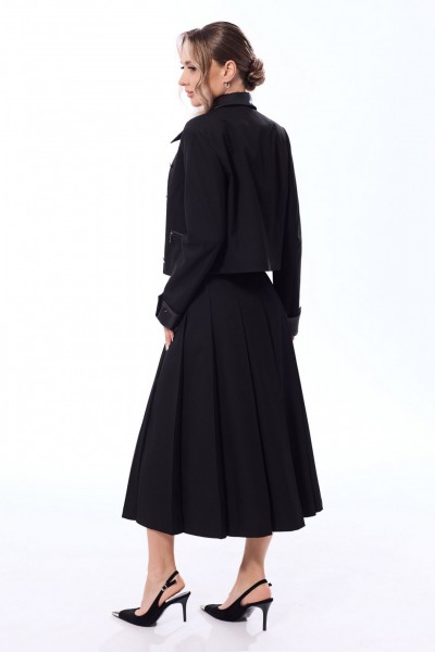 Жакет с центральной застежкой на петли и пуговицы, втачным воротником. По переду с рельефами, выходящими из проймы, на уровне линии талии расположены прорезные карманы в рамку с молниями. По спинке со средним швом и рельефами, выходящими из проймы. Рукав втачной, длинный, с отложной манжетой. Манжета закреплена к рукаву петлями и пуговицами. Юбка с отрезным поясом, односторонними складками по передней и задней половинке. На поясе- декоративная завязка, закрепленная полукольцами. На переднем полотнище- асимметричный разрез с застежкой на петли и пуговицы.