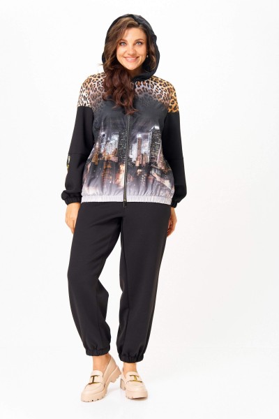 Костюм женский спортивный, состоящий из куртки и брюк. Костюм выполнен из 2-х видов ткани. Куртка с капюшоном свободного кроя на талии с прорезными карманами, застежка молния. Украшением куртки служит деталь из 3D сетки и нашивки на рукаве. Низ рукавов и низ куртки на эластичной манжете. Брюки заужены к низу, с карманами. Брюки на резинке по талии. Низ брюк на манжете с резинкой.