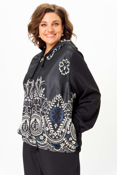 Костюм женский спортивный, состоящий из куртки и брюк. Костюм выполнен из 2-х видов ткани. Куртка с капюшоном свободного кроя на талии с прорезными карманами, застежка молния.Низ рукавов и низ куртки на эластичной манжете. Брюки заужены к низу, с карманами. Брюки на резинке по талии. Низ брюк на манжете с резинкой.