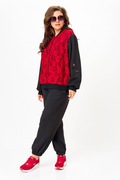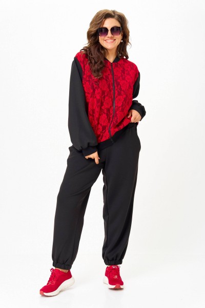 Костюм женский спортивный, состоящий из бомбера и брюк. Легкий джемпер-бомбер, предназначен для молодых и стильных женщин. Выполнен из двойной костюмно-плательной ткани. Перед и спинка выполнены из гипюра. Стойка-воротника выполнена из ткани кашкорсе, из этой же ткани выполнены манжеты на рукавах. По центру изделия молния. Украшением изделия служит нашивка на рукаве.