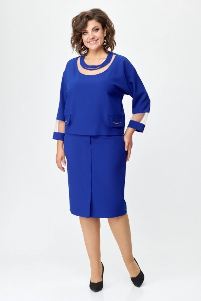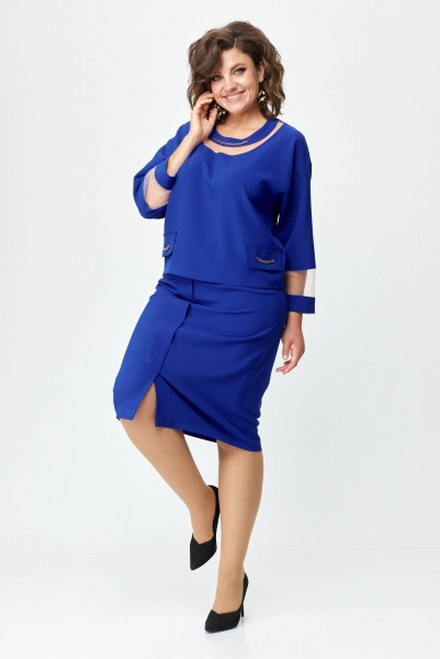 Элегантный женский костюм состоящий из блузы и юбки. Блуза свободного силуэта летучая мышь со спущенным рукавом. Горловина переда состоит из сетки и декоративной планки. Рукав заканчивается манжетой. По передней части костюма клапаны и горловина декорированы отделочной металлической цепочкой. Спинка со средним швом на обтачке. На заднем полотнище по центру потайная молния. На переднем цельнокроеная складка имитирующая планку заканчивающейся шлицей. Юбка на подкладке. Длина блузы 54 см, длина юбки 64 см.