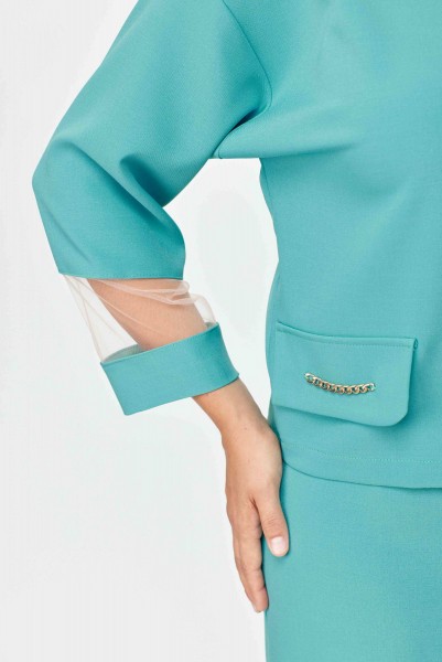 Элегантный женский костюм состоящий из блузы и юбки. Блуза свободного силуэта летучая мышь со спущенным рукавом. Горловина переда состоит из сетки и декоративной планки. Рукав заканчивается манжетой. По передней части костюма клапаны и горловина декорированы отделочной металлической цепочкой. Спинка со средним швом на обтачке. На заднем полотнище по центру потайная молния. На переднем цельнокроеная складка имитирующая планку заканчивающейся шлицей. Юбка на подкладке. Длина блузы 54 см, длина юбки 64 см.