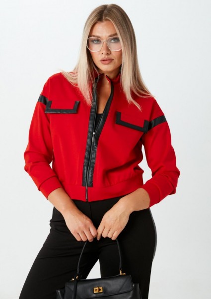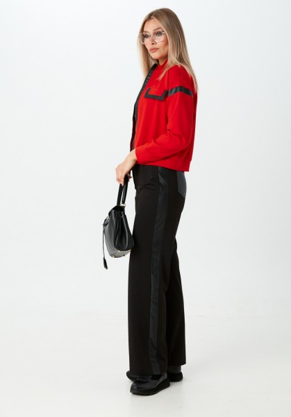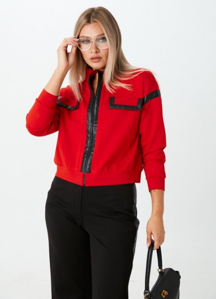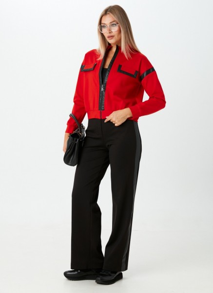 Комплект 2ка, состоящий из джемпера и брюк. Укороченный джемпер свободного силуэта с застёжкой на молнию. Воротник - стойка. По переду выполнена имитация карманов с клапанами с окантовкой из экокожи. На рукавах и вдоль молнии также вставка из экокожи. Брюки прямого силуэта свободного объёма. Застёжка на молнию и пуговицу. Вдоль боковых швов расположены лампасы из экокожи. Пояс и задние накладные карманы также выполнены из экокожи.