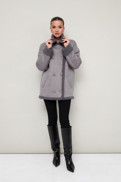Женская дубленка прямого силуэта, длиной до середины бедра. Воротник и лацканы отложные. Застёжка двубортная на петли и обтяжные пуговицы. Спереди обработаны функциональные карманы с листочкой. Спущенная линия втачивая плеча, длинные двухшовные рукава с отворотом. Спинка с отрезной кокеткой.