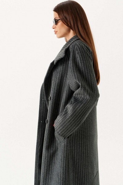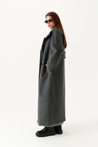 Пальто из трикотажного полотна прямого силуэта, с центральной двубортной застежкой на петли и пуговицы, на подкладке. Воротник – стойка с застежкой на петли и пуговицы. Полочки с прорезными карманами с листочкой. Спинка со средним швом и шлицей. Рукав – реглан. В комплекте пояс из основной ткани.