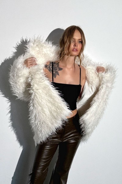 Шуба свободного покроя из длинноворсового меха под ламу.