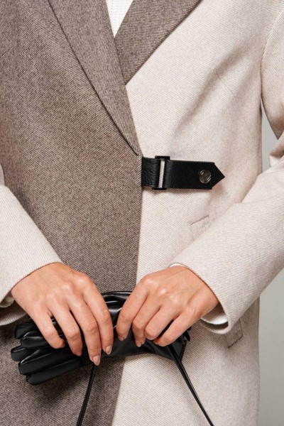 Застёжка смещенная на две внутренние кнопки и на потайную петлю с пуговицей. Изделие дополняется декоративной застёжкой-пояском с металлической пряжкой и кожаной патой с фиксацией на кнопке.
