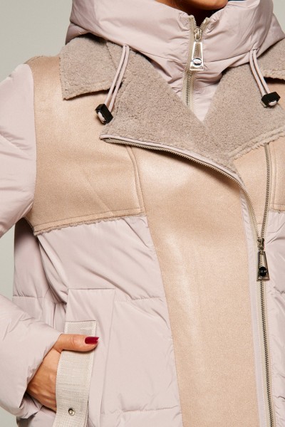 Капюшон с манишкой съемный (на потайных пуговицах) умеренного объема с дополнительной двусторонней застежкой молнией по центру. По периметру капюшона протянут шнур в цвет изделия с декоративными металлическими фиксаторами.