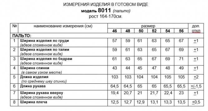 таблица размеров