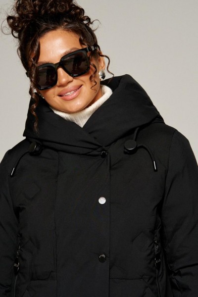 Капюшон умеренного объема. По периметру капюшона с внешней стороны вставлен шнур в цвет изделия с декоративными фиксаторами и наконечниками.