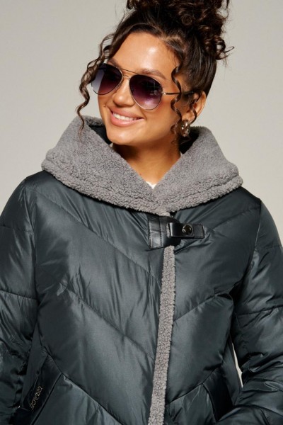 Застежка центральная на двустороннюю молнию от верха до низа и кнопки. Под капюшоном спереди настрочен дополнительный элемент застежки из экокожи.