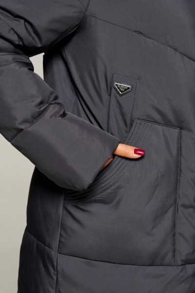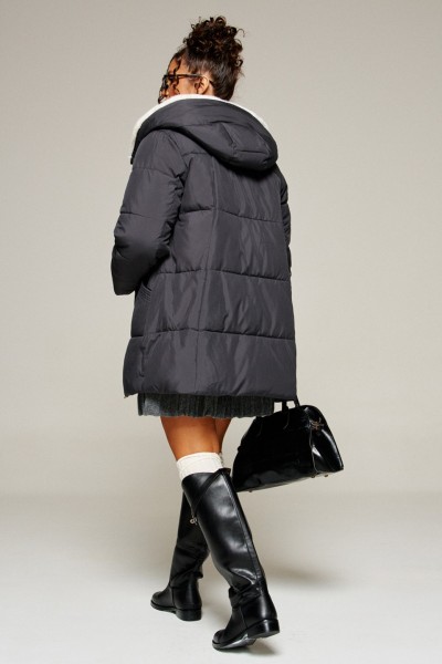 Капюшон с застежкой спереди умеренного объема. По периметру капюшона с внутренней стороны выполнена оторочка из искусственного меха, которая выполняет декоративную и защитную функции, создавая дополнительное тепло и защиту от ветра и холода.